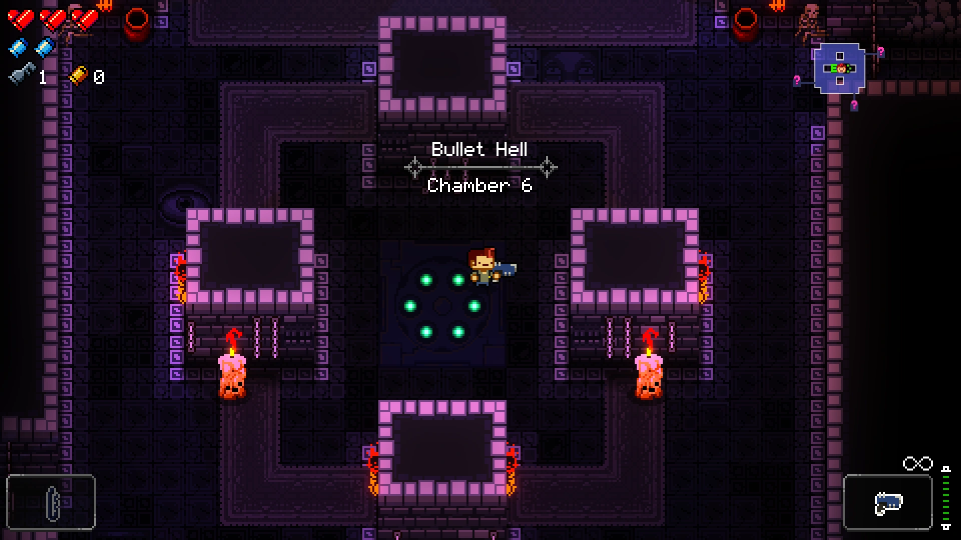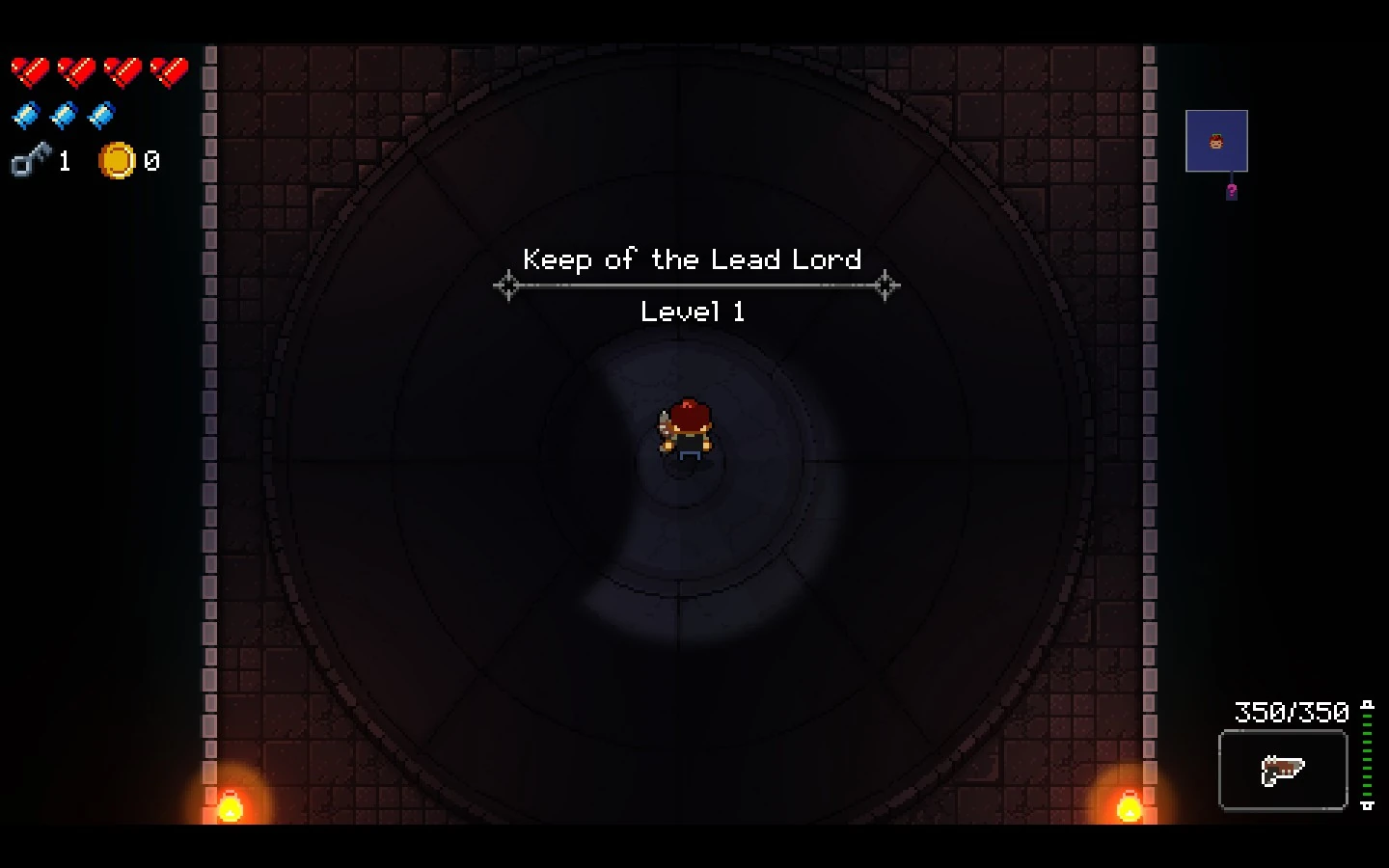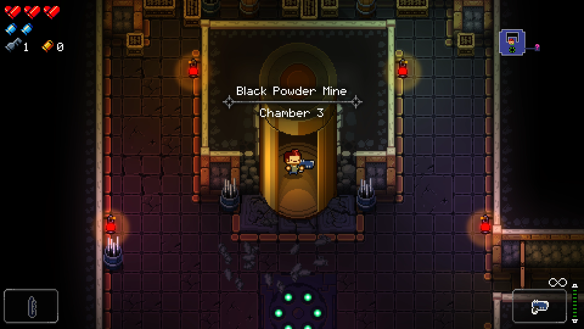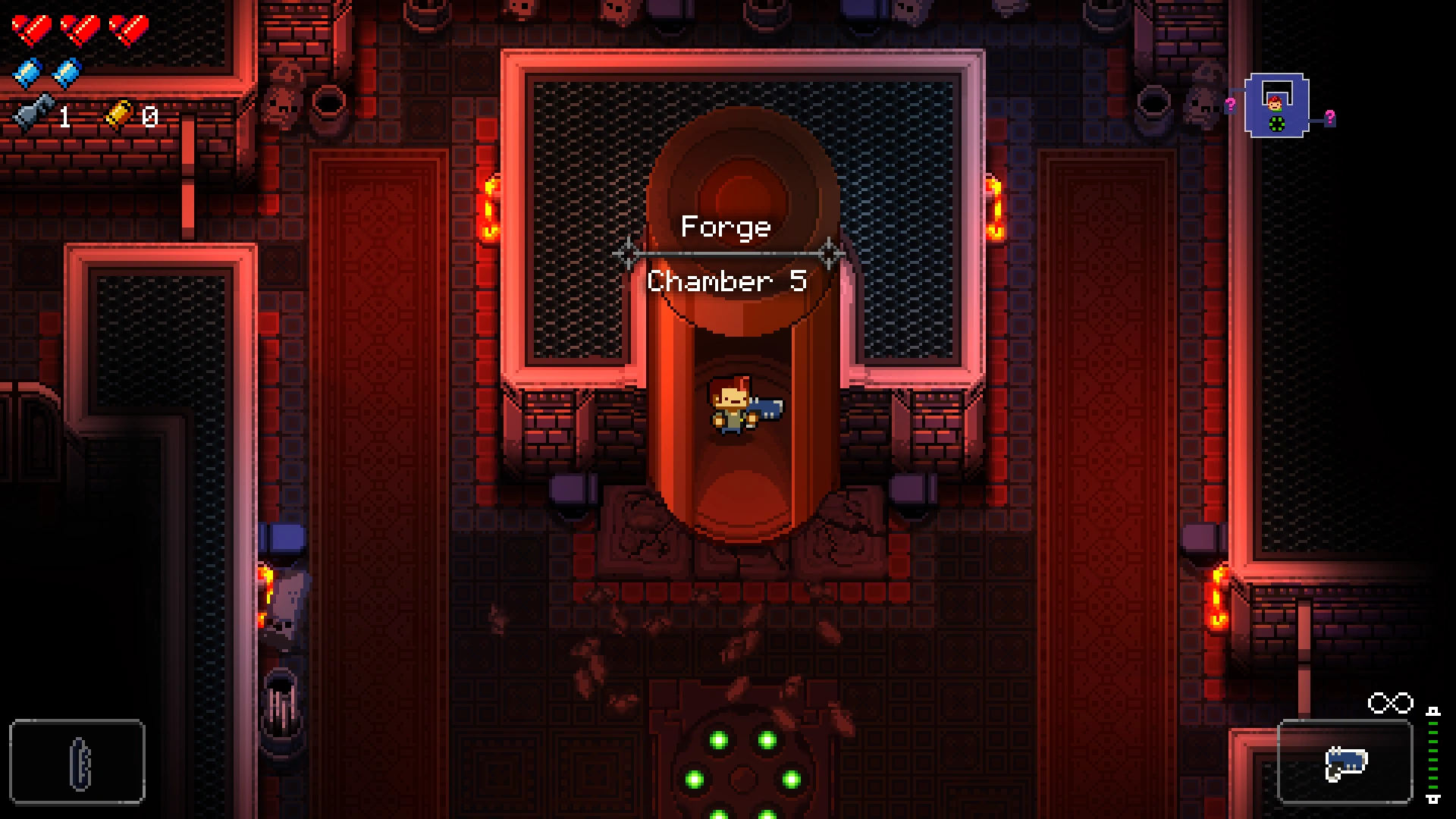 Chamber 1 from an early version of the game. The player is shown starting with an extra heart & blank, and different looking items as well as limited ammo for their starting gun. There is also no Hero Shrine present.