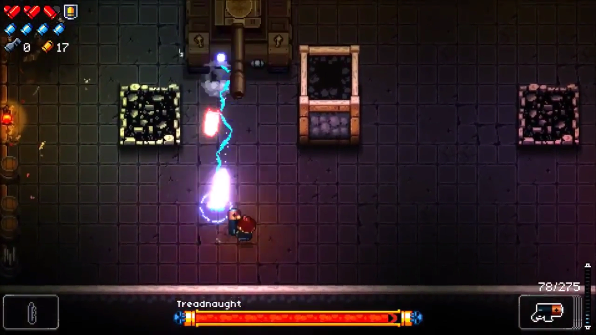 Treadnaught moves towards the player, firing bullets from its corner turrets and occasionally its driver. In addition, Treadnaught has 5 special attacks: